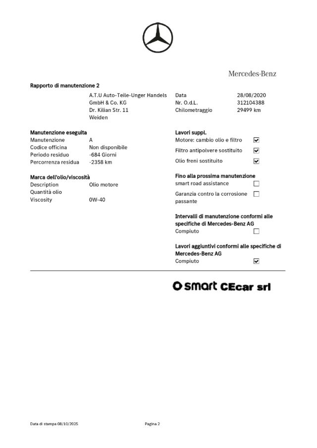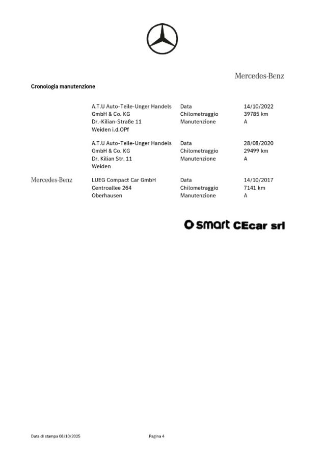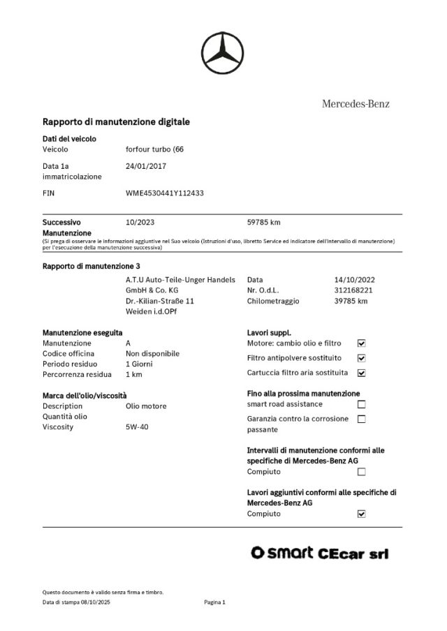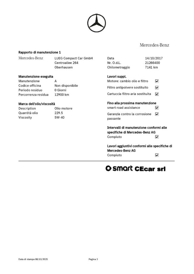 -DSB: storicità dei chilometri percorsi e degli interventi di manutenzione effettuati con il rilascio dell'attestazione del Certificato vettura dal DBS (Digital Service Booklet) estratto dal datebase della Fabbrica Smart