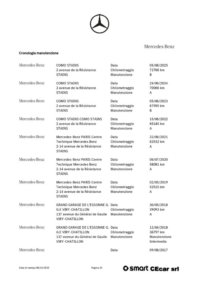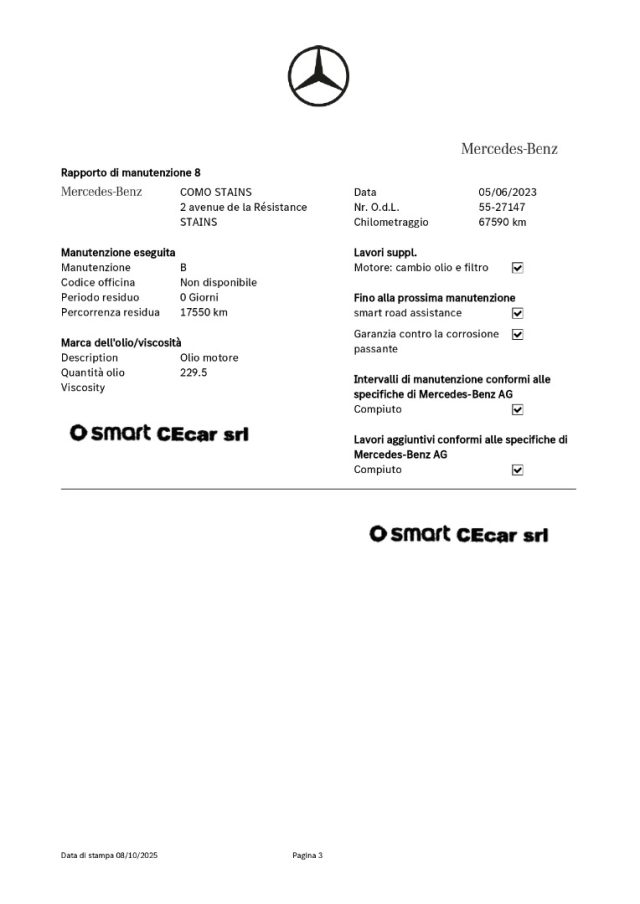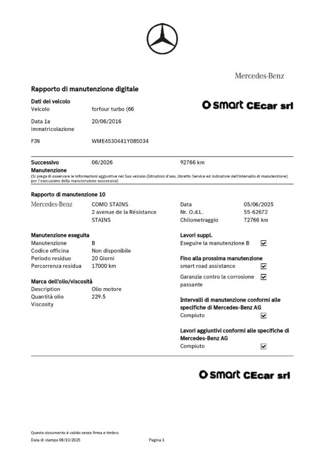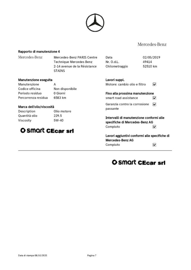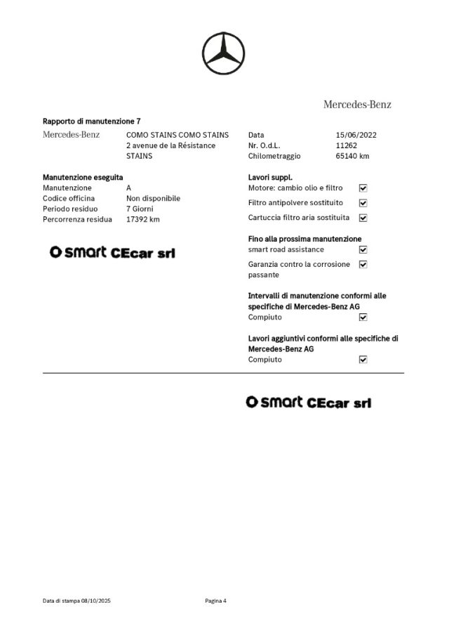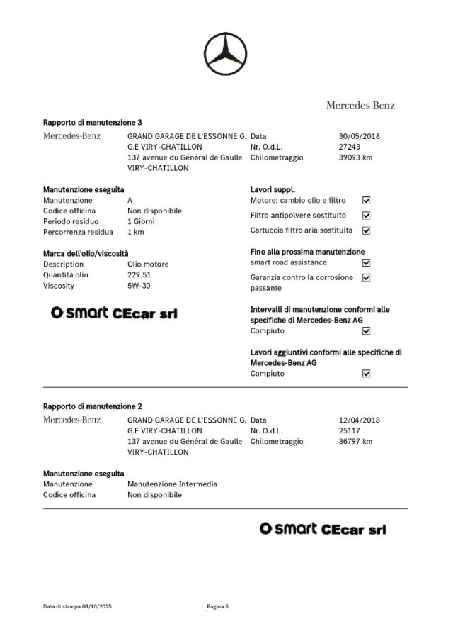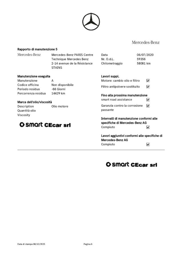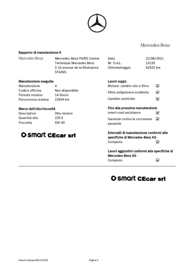 -DSB: storicità dei chilometri percorsi e degli interventi di manutenzione effettuati con il rilascio dell'attestazione del Certificato vettura dal DBS (Digital Service Booklet) estratto dal datebase della Fabbrica Smart