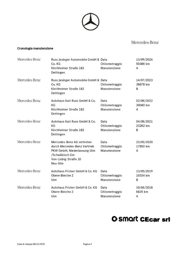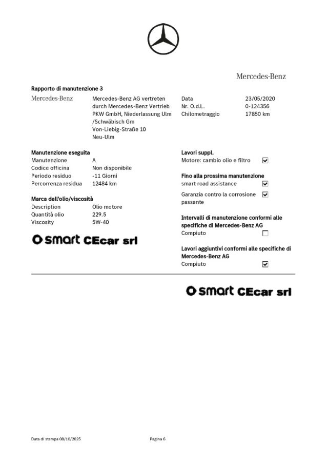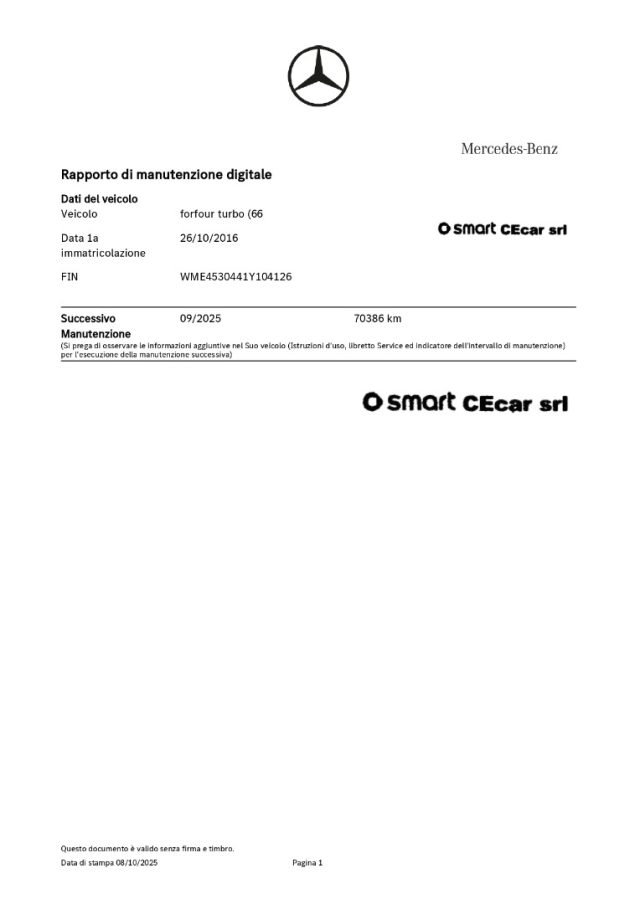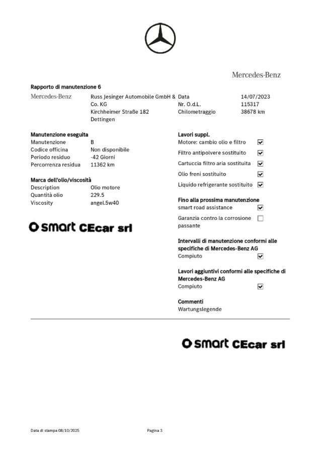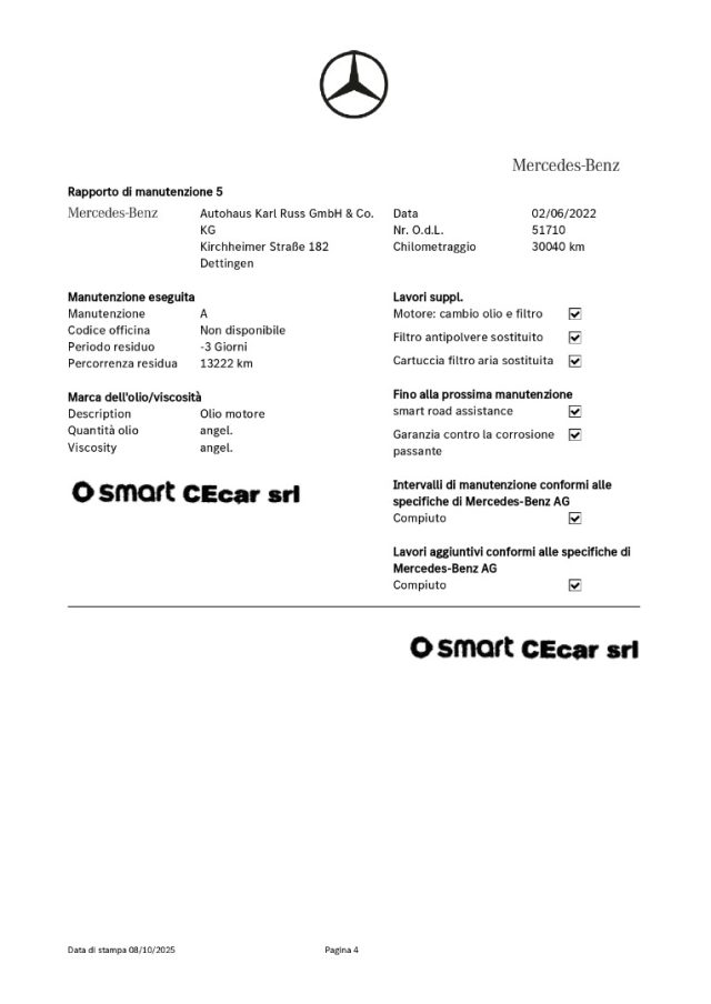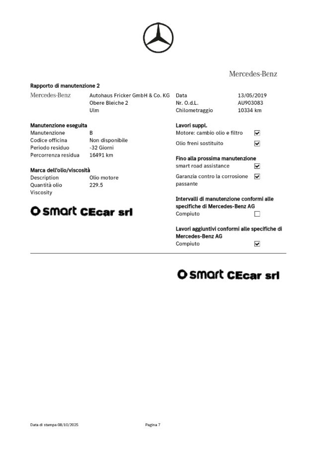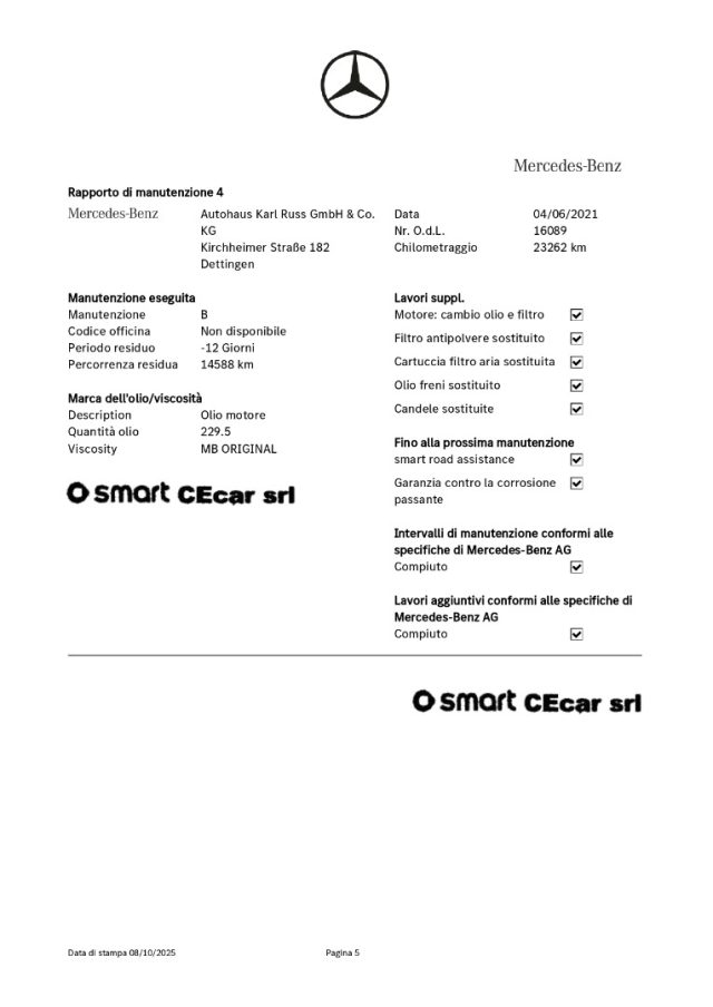 -DSB: storicità dei chilometri percorsi e degli interventi di manutenzione effettuati con il rilascio dell'attestazione del Certificato vettura dal DBS (Digital Service Booklet) estratto dal datebase della Fabbrica Smart