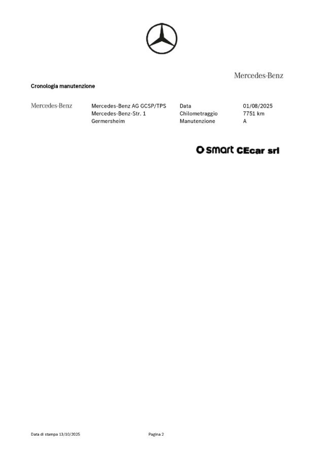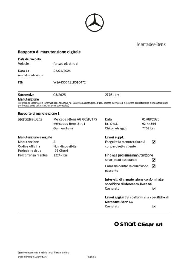 -ACCORDO ASSISTENZA MERCEDES-BENZ ITALIA: su tutte le Smart Direzionali è possibile pianificare sia la manutenzione ordinaria che straordinaria, con un minimo importo mensile, attivando il Contratto Service Plus esclusivamente con MERCEDES-BENZ ITALIA SpA (Filiale italiana della DAIMLER AG.).